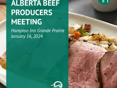 Join fellow beef producers for a chance to connect and converse over a beef dinner provided by a local catering crew at the Hampton Inn and Suites by Hilton Grande Prairie, on January 16, 2024, from 4:30 to 10:30 p.m.