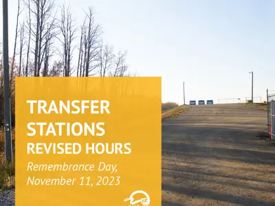 The Bonanza, Blueberry, Gundy, and Woking Transfer Stations will remain open on Saturday, November 11, 2023. Transfer Stations will open at 12 p.m. (Noon) instead of the usual 10 a.m. Bonanza, Blueberry, and Woking Transfer Stations will be open 12-6 p.m. and Gundy Transfer Station will be open 12-4 p.m.