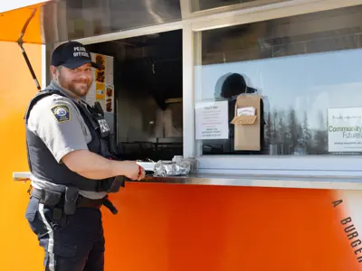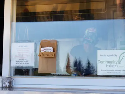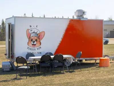 M&K Burger Run, owned and operated by Blueberry Mountain local, Mernie Grinder, is located at the Ksituan Water Treatment Plant, by the Saddle Hills County Administration Building.