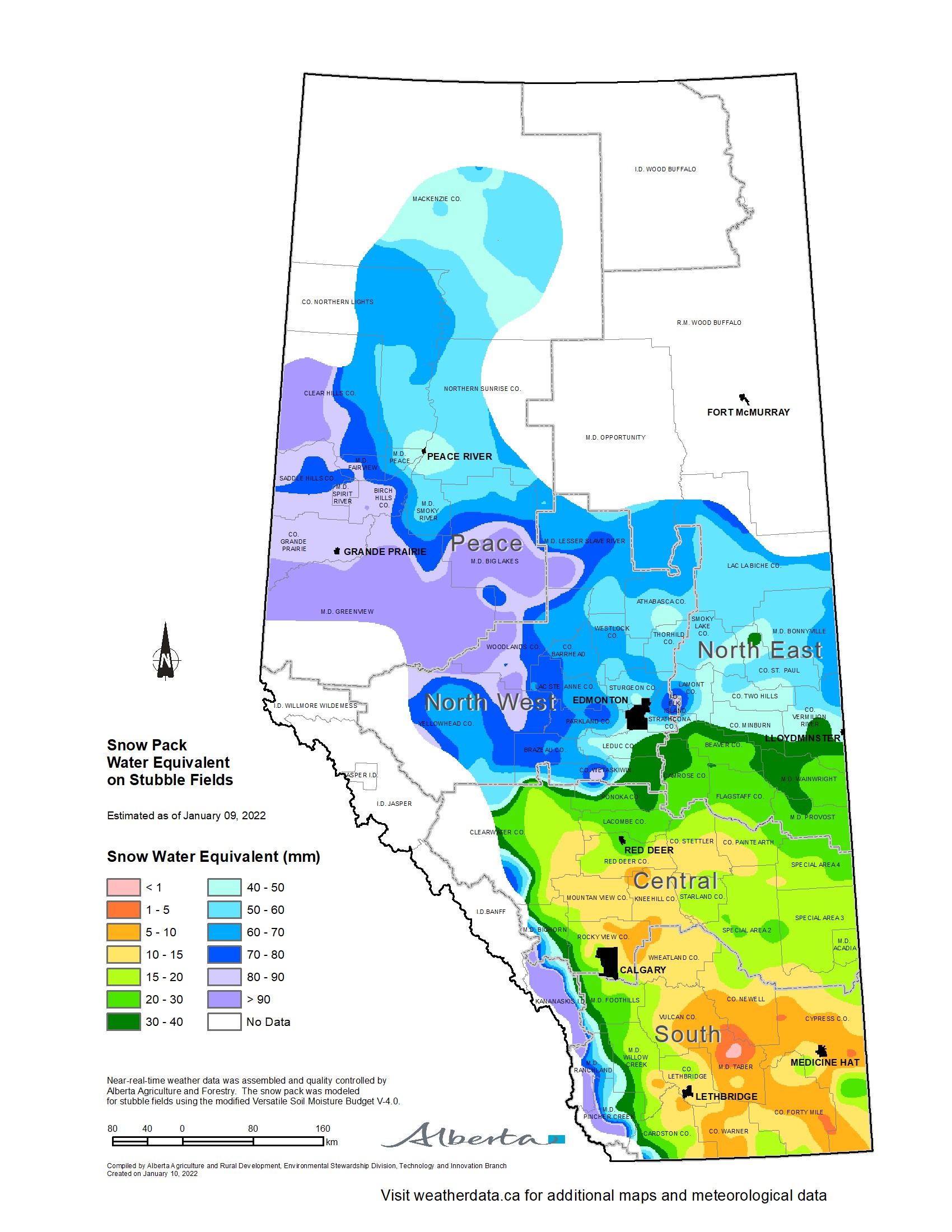 South of Red Deer SWE is generally less than 15 mm and parts of southern Alberta have snow packs containing less than 10mm of SWE. However across the south, it’s not uncommon to have snow free conditions at this time of year and thus, it’s considered normal to have little to no snow on the ground (map 2).