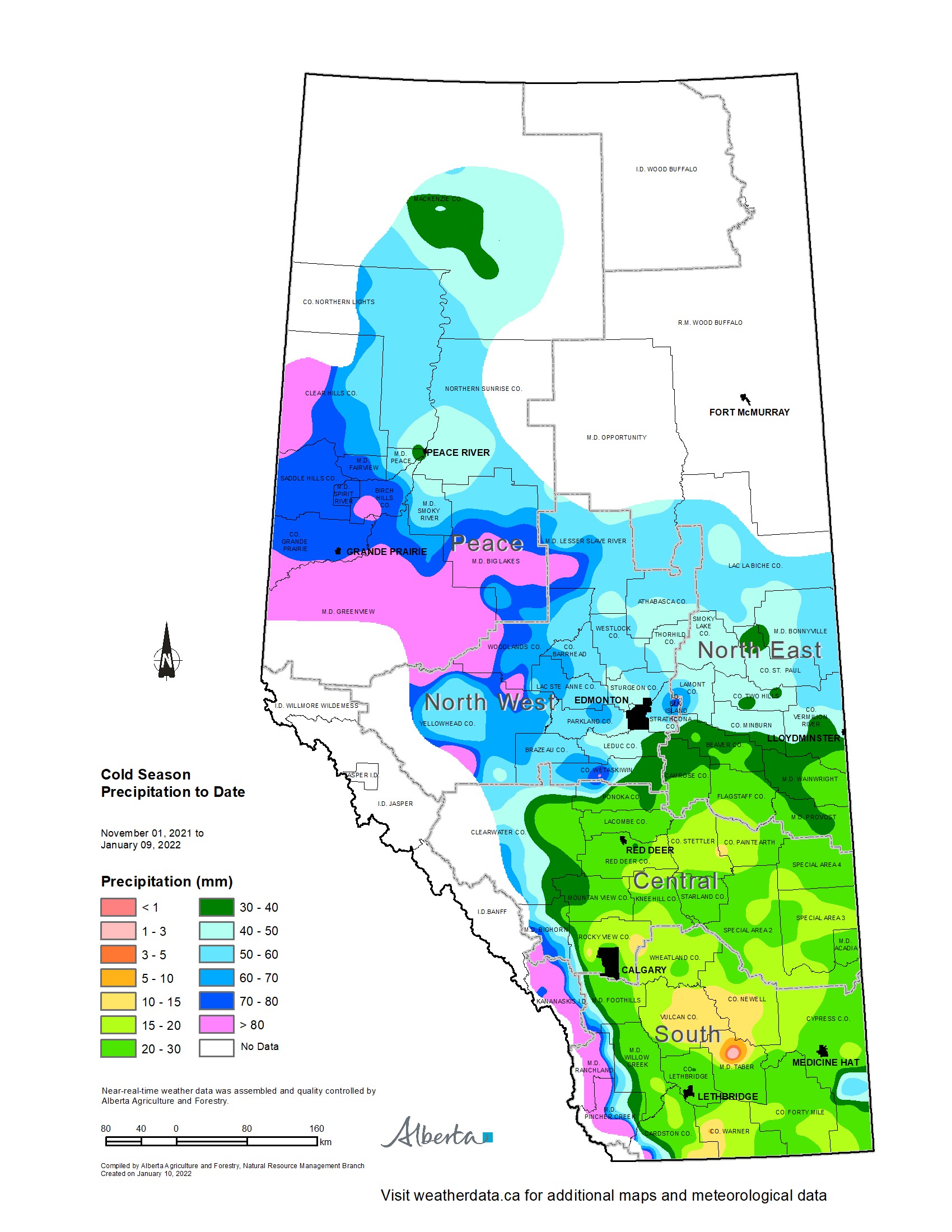 The Cold Season (November to March), on average accounts for about 20% of the total annual precipitation across the south, ranging up to about 35% through parts of the Peace Region. Thus, precipitation deficits with respect to cropping, are not as severe as they would otherwise be in the May to Mid-August period when crops are actively growing.