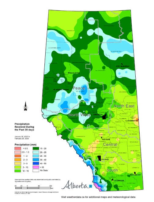 The areas of the province reporting higher than normal snowpacks, have declined compared to the last report. An increase in below normal snowpack conditions at this time is not abnormal in itself as February is the driest month of the year, as mentioned earlier. For agriculture, May, June, and July remain the most important months for receiving precipitation. The 2025 cropping season is only a few months away. We are beginning to move into what has traditionally been Alberta’s wetter period, meaning there is ample time to receive adequate moisture.