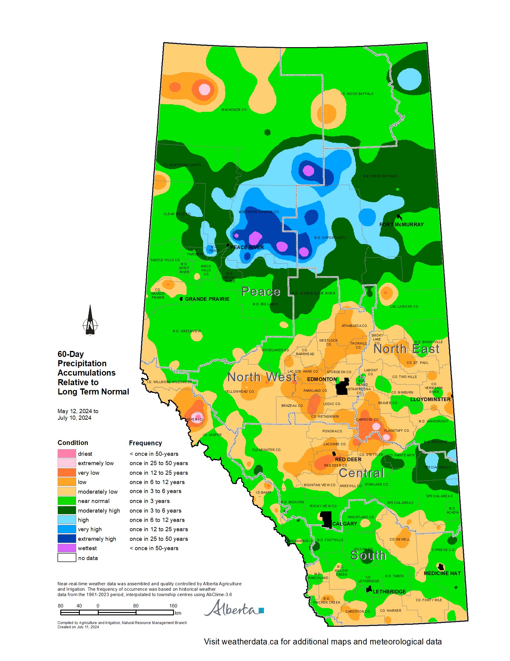 It’s uncertain what effect recent moisture deficits will have on this year’s crop yields, but it is clear that optimal growth will not be maintained in many of the dry areas. Next week’s Alberta Crop Report should shed some light on how this heat has been affecting crops. Moving forward, rain and cooler temperatures will be needed very soon if current yield potential is to remain on track.