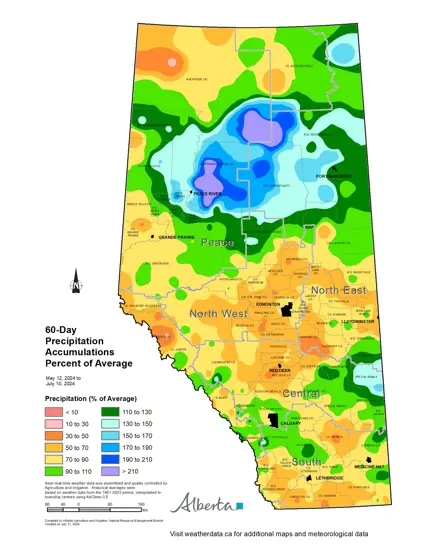Maps 6, 7, & 8: Due to a lack of rain over the past week, 60-day precipitation deficits are intensifying and expanding, and now extend across most of the North West and North East Regions, north-western portions of the Central Region, and parts of the Southern Region (Map 6). The driest areas are found in Camrose and Flagstaff Counties, with once in 25-year lows beginning to emerge. Several lands have seen less than 70% of normal rainfall, with some small pockets of less than 50% of average appearing in each of the four regions (Map 7). Total precipitation accumulations range from less than 60 mm in some areas, to over 260 mm through parts of the eastern Peace Region (Map 8).