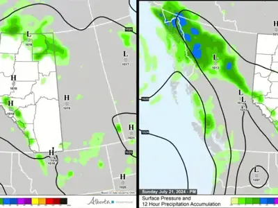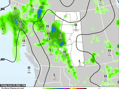 Current 12 hour precipitation forecasts for today, courtesy of Alberta Forestry and Parks Fire Weather Section (Map 8), Friday (Map 9), and Saturday and Sunday (Map 10), indicate that most of the moisture we expect to receive over the next few days will be concentrated along Alberta’s western border.