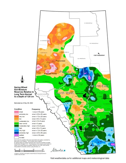 Precipitation over the last 30-days has been at least near normal across most of our agricultural lands, with parts of the North West and Central Peace Region remaining dry and suffering from once in 3 to 12 year lows (Map 3). Drought stricken areas across the eastern half of the province are mostly trending to once in 6 to 12 year highs, with some areas seeing it this wet on average less than once every 50-years. Most of the precipitation fell over several days and had the opportunity to soak deep into the soil, which marks a great start to the growing season.