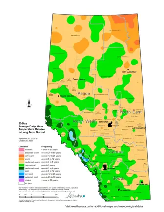 The most significant precipitation fell across parts of the Peace, North West, and North East Regions. Between 25 to 70 mm of precipitation fell in isolated areas, which is close to double the normal precipitation for the month of October (Maps 2 and 3). This brought much needed moisture to the area, and will help replenish long-standing precipitation deficits and soil moisture reserves.