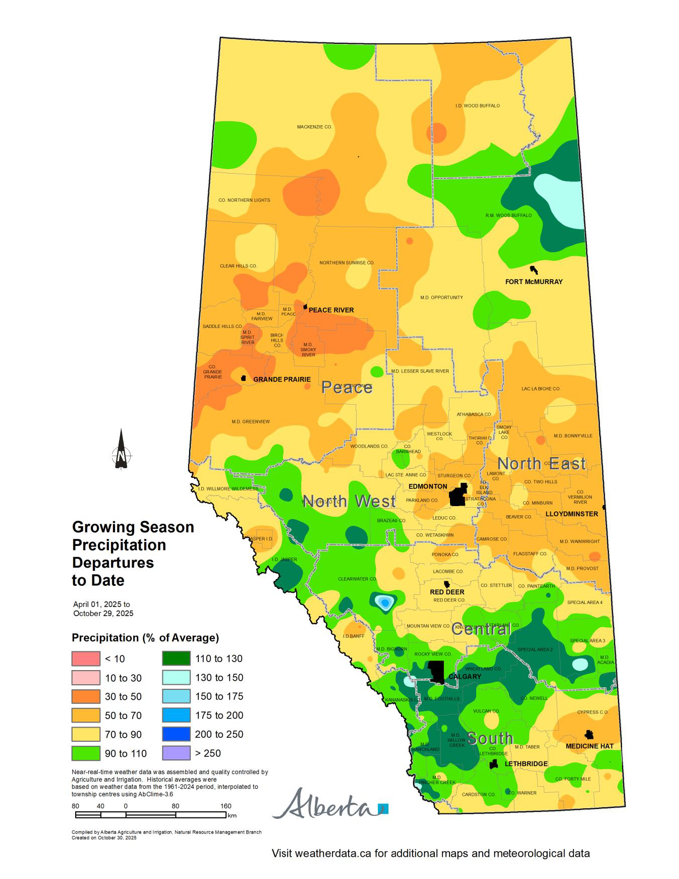Across the North East Peace and most of the North West Regions, growing season precipitation continues to range from low to driest, relative to long-term normal (Map 5). Thanks to October precipitation, some areas in these regions did improve their growing season accumulation. It is hoped that much of that moisture will go toward recharging soil moisture conditions. Most areas across these regions received less than 70% of their long-term average growing season precipitation (Map 6). Although, the zones with precipitation departures of 30% to 50% of normal did shrink within the counties of Lac La Biche, Grande Prairie, Birch Hills, Smoky River, Big Lakes, Greenview, Saddle Hills, Fairview, Peace, Northern Sunrise, Northern Lights, and Mackenzie.