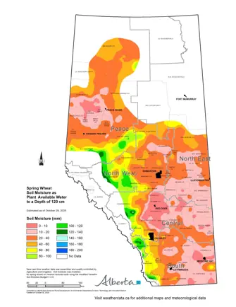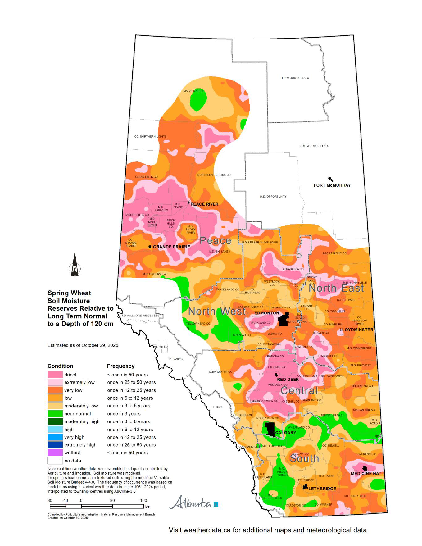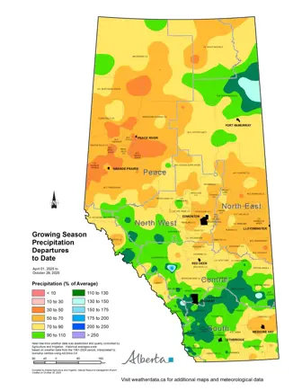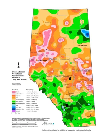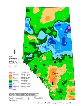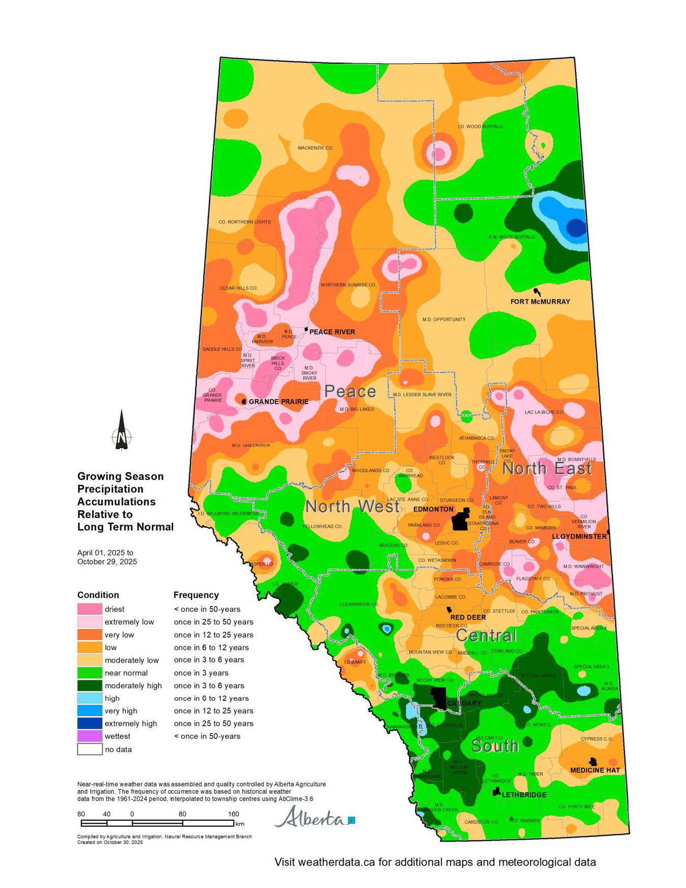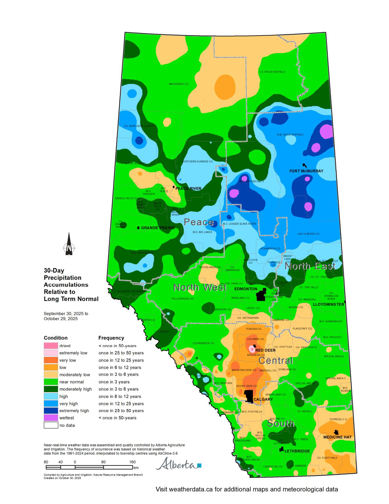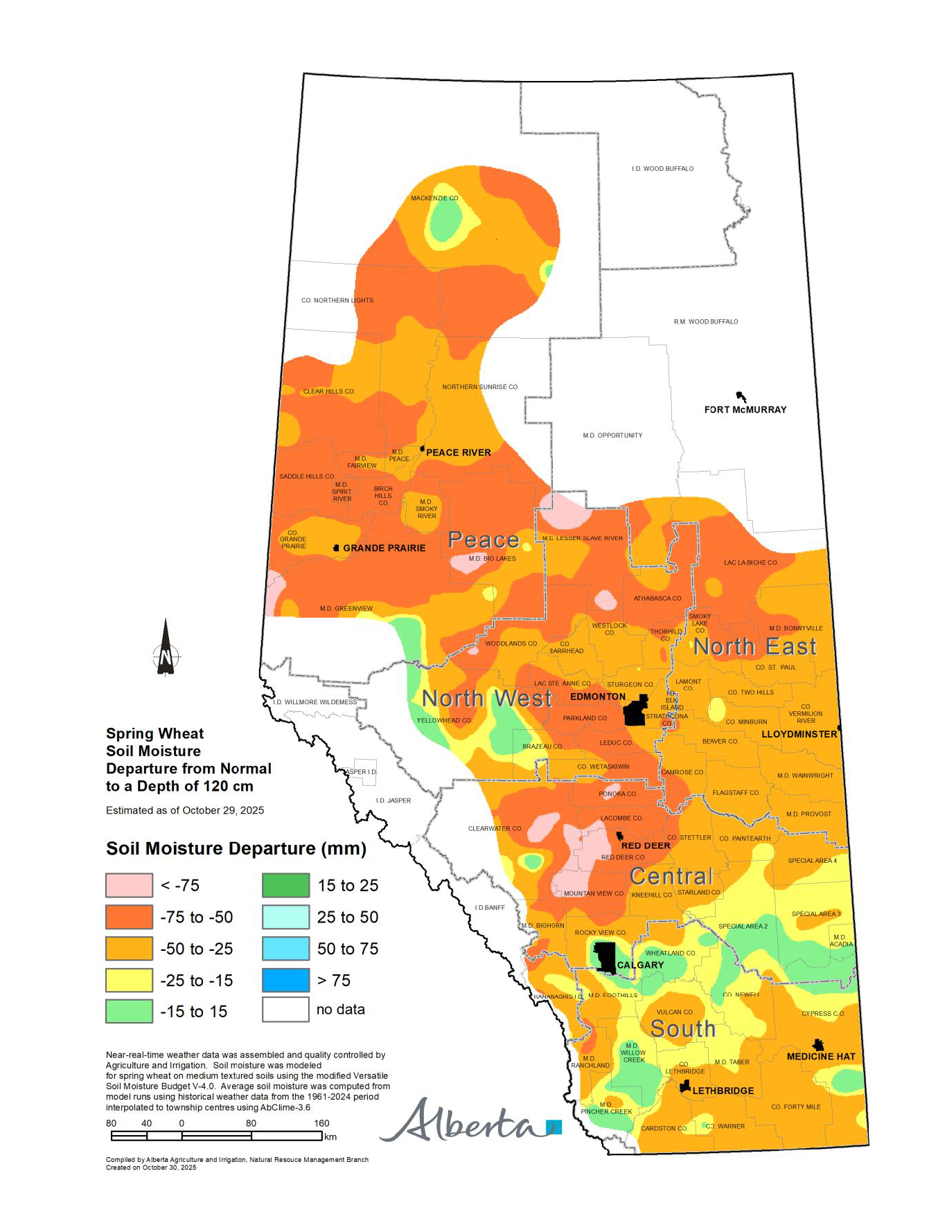 This amount of precipitation is normal to moderately higher than normal (Map 3), which is beneficial to the area, as it received less moisture than usual through the 2025 growing season. Several areas across the central and northern Peace Region received less than 25 mm of precipitation, amounts much closer to normal or moderately lower than normal for this time of the year (Maps 1 and 3).