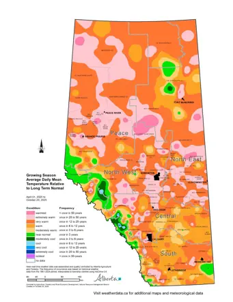 Across Alberta the average daily mean temperature for the growing season has been warm to very warm, relative to long-term normal (Map 10).