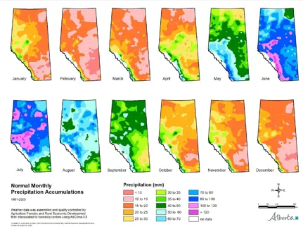Looking forward, winter (November to March) on average only accounts for about 20% of the annual moisture across the southern portions on the province and up to 35% of the average moisture across the Peace Region. Deep winter snowpacks will be needed to help bring relief to dwindling surface water supplies and ample rains in May, June, and July will be needed to sustain crops, replenish soil moisture reserves, and support strong crop growth.