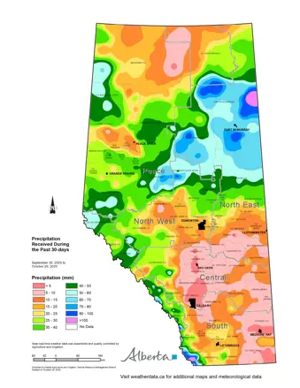Rainfall across the North West and North East Regions ranged from 10 to 70 mm (Map 1). The highest rainfall fell across the Northern portion of these regions, through the municipalities of Greenview, Big Lakes Lesser Slave Lake, Athabasca, and Lac La Biche County, decreasing to the south and east. These regions received near normal October precipitation, with a few areas receiving moderately high to very high precipitation relative to long term normal (Map 3). This is beneficial for soil moisture recharge in these areas, as they received less moisture than usual through the 2025 growing season.