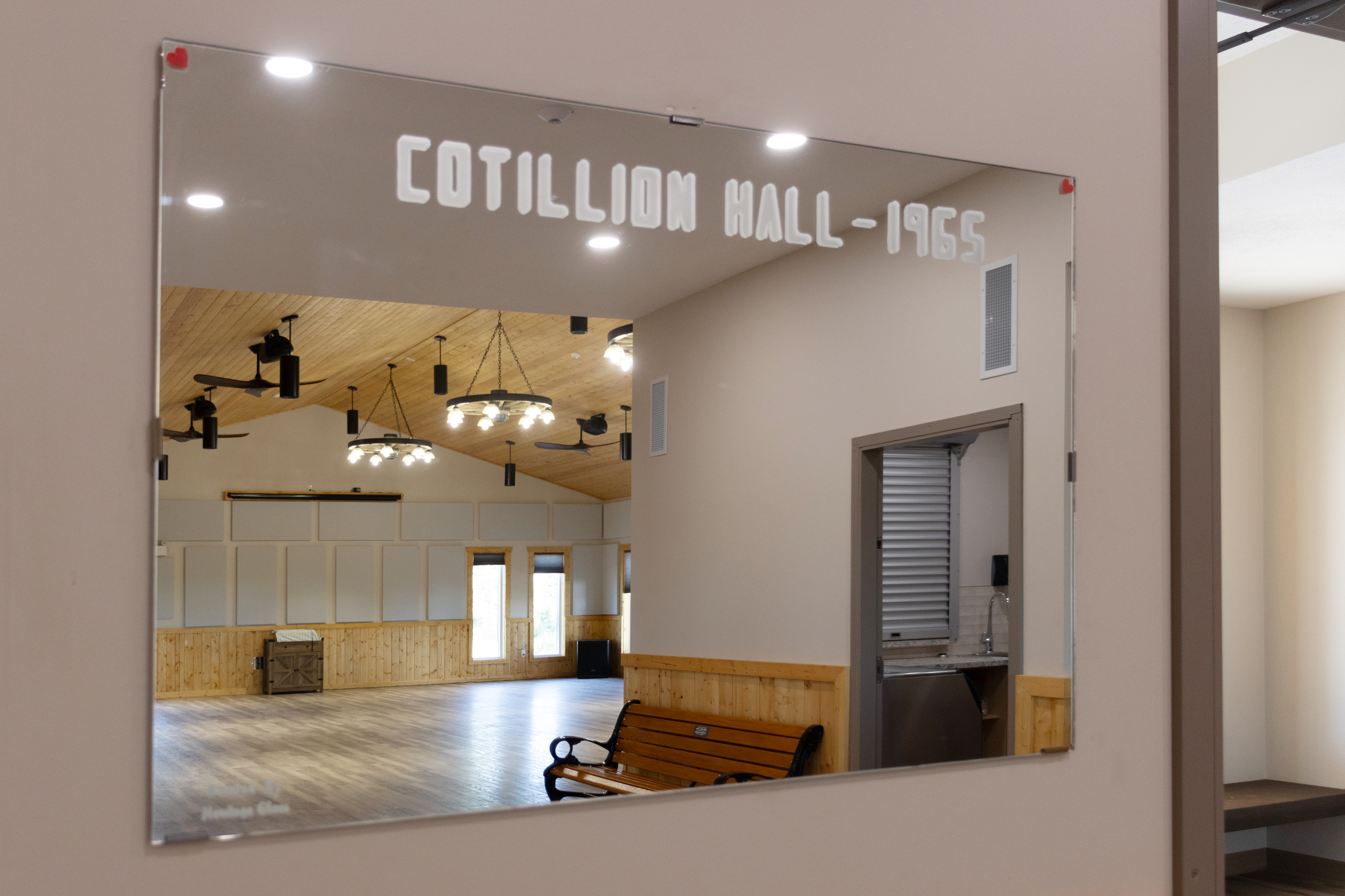 The new hall is a replacement of the original, built by community members on donated land in 1965, and took approximately two years to complete. Building committee lead, and local resident, Darryl Bates, saw the project through to completion, organizing and participating in construction efforts. To commemorate his work on the project, he was presented with tokens of appreciation, including a bench inscribed, "In heartfelt appreciation of your outstanding service, dedication, and commitment during the construction of the new Cotillion Hall."