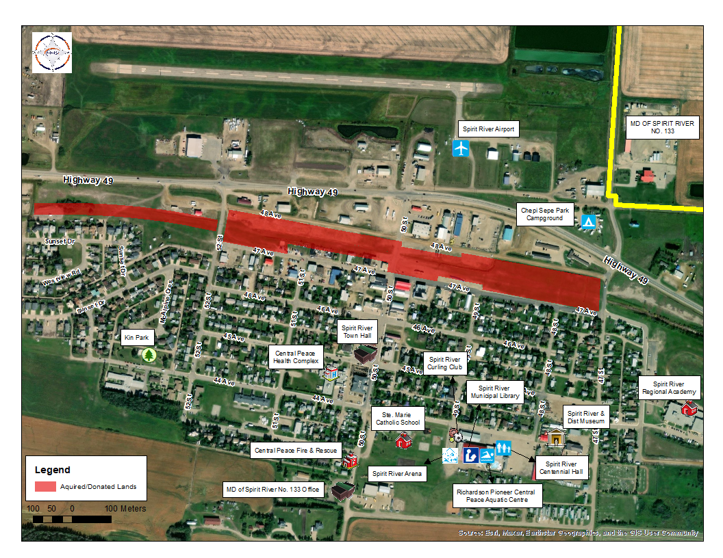 In Fall 2023, the Town of Spirit River acquired several parcels of land from Canadian National Railway (CN) Company. All the parcels are currently vacant and have been consolidated into three pieces, with a combined area of 17.75 acres (7.18 hectares). Another small piece of land (0.14 acres), which is also vacant, was donated by United Farmers of Alberta (UFA) to the Town of Spirit River, on the condition that it is used as green space. All four properties are located adjacent to 52 St, 50 St, and 47 St, south of Highway 49.