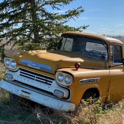 "The photo of the truck displays the vintage pickup beside a modern field."