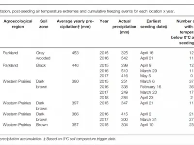 At sites south of 51°N latitude, seeding between soil temperatures of 2°C and 4°C provided the greatest grain yield (Table 2). Seeding ultra-early into 0°C soils did not result in lower grain yield than waiting and seeding into soils at 6°C to 8°C, and actually resulted in greater grain yield than waiting for soils to reach 10°C prior to seeding. Ultra-early seeding did not significantly affect grain protein content, test weight, or thousand kernel weight of grain. Nor did it affect plant height or the number of heads per plant.