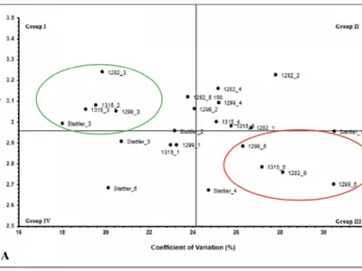 Figure 1: Biplots summarizing yield means vs. coefficient of variation for sites south of 51°N latitude. Abbreviations are as follows: I) First number/name represents the wheat line (AC Stettler, LQ1282A, LQ1299A, LQ1315A). II) Second number represents planting date 1 (earliest) – 6 (latest). Grouping categories: group I: high mean, low variability; group II: high mean, high variability; group III) low mean, high variability; group IV) low mean, low variability.