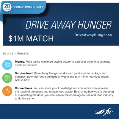 Farm Credit Canada (FCC) is marking 20 years of Drive Away Hunger by announcing that it will match up to $1 million in new donations to food security agencies in Canada.